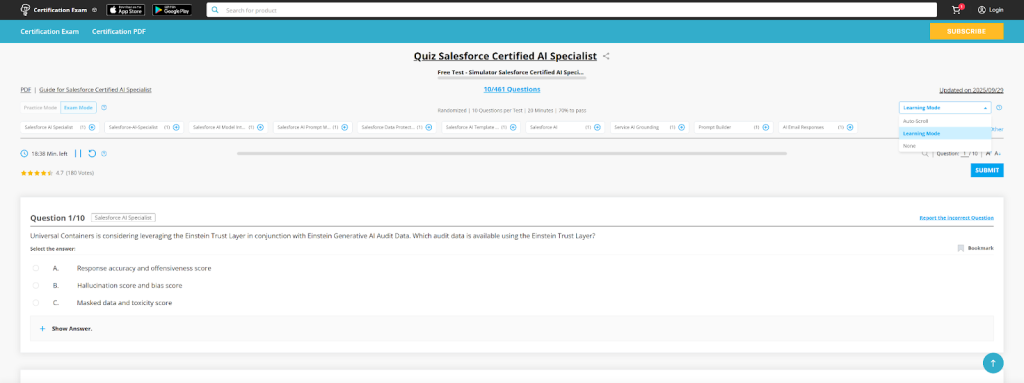 - Week 5-6: Practice & Integration Start doing practice exams that can be found from platforms such as Certification-Exam. Concentrate on the ‘why’ for every answer, especially as there are some tricky Salesforce AI Specialist Certification Dumps.