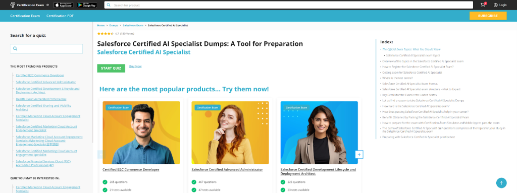 Though both of them can provide general Salesforce exam preparation, especially the Certification-Exam dump cover AI-specific content is important for AI Specialist Certificate holders. This is because on their platform, although I did not test it myself I am sure it must work, there are larger question banks which in turn would seem to indicate a bias toward newer and more special certifications such as the AI Specialist. If you are someone who needs to learn Fundamental Salesforce Admin Certification Questions and also some advanced AI topics, then all will run smoothly if the shanghaisymphony.com provides both in one place.